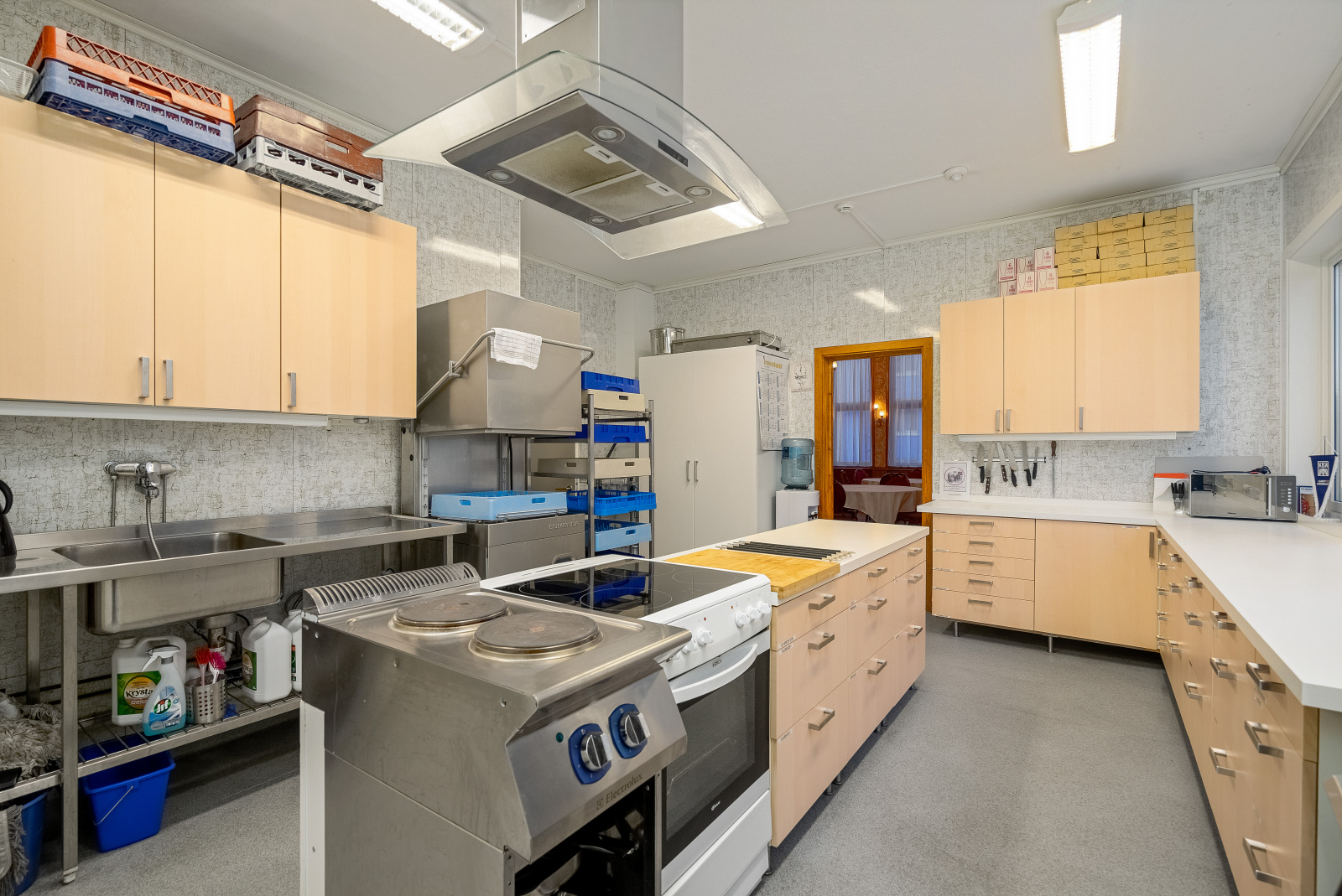 Stort kjøkken med det som trengs for å tilberede og servere mat til små og store selskap.